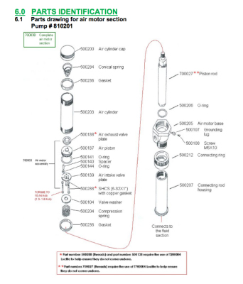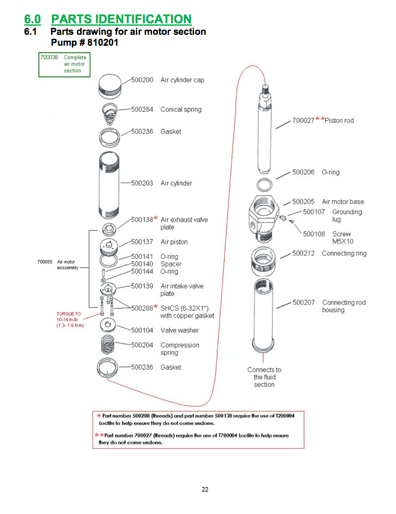 2:1 Ratio Transfer Pump | Air motor section pump # 810201 Graco IP-02 Polyurethane Transfer Pump (click to zoom) Find the Parts That You Need Browse Our List to find the manual or part that you need Click Here Let us Repair Your Machine for You Contact Us Today Click Here Ref. Part Description QTY. 500200 Air cylinder cap 500284 Conical spring 500236 Gasket 500203 Air cylinder 500138 Air exhaust valve plate 500137 Air piston 500141 O-ring 500140 Spacer 500144 O-ring 500139 Air intake valve plate 500288 SHCS (6-32X1") with copper gasket 500104 Valve washer 500204 Compression spring 500236 Gasket 700027 Piston rod 500206 O-ring 500205 Air motor base 500107 Grounding lug 500108 Screw M5X10 500212 Connecting ring 500207 Connecting rod housing Name Email Phone