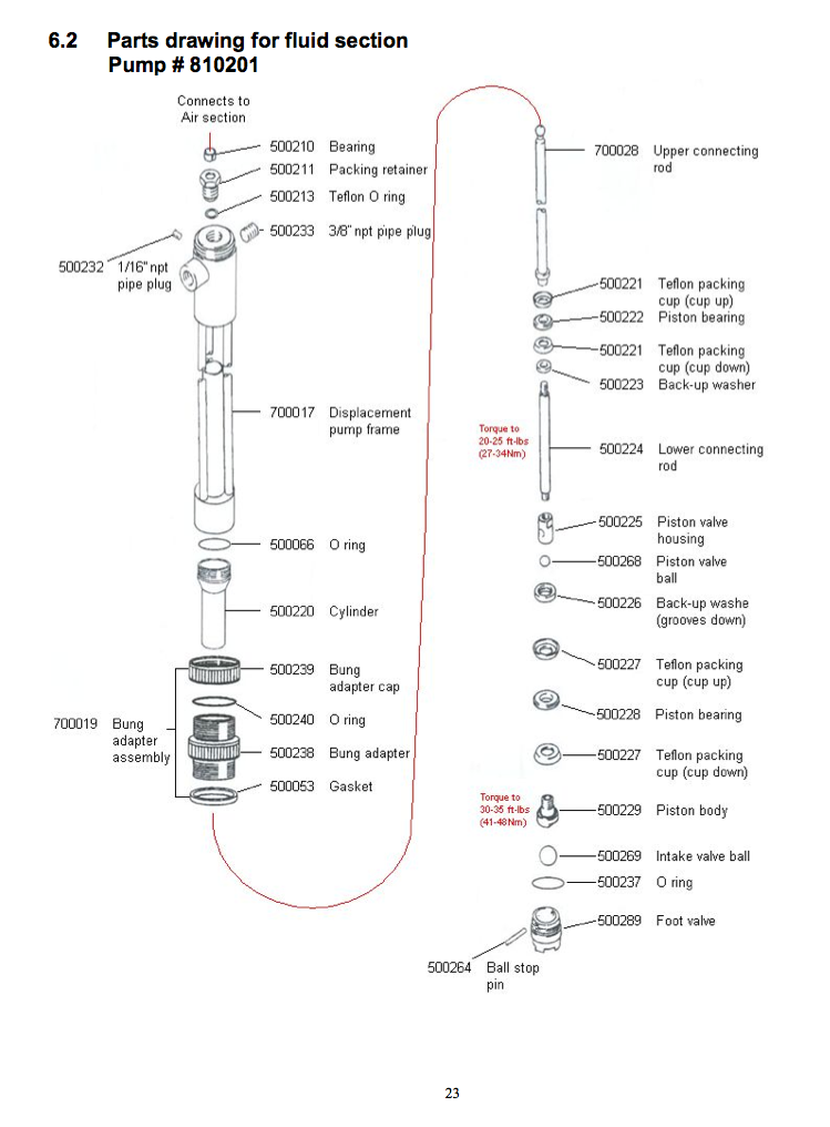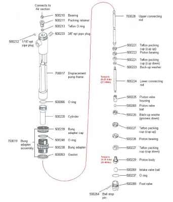 2:1 Ratio Transfer Pump | Fluid section pump # 810201 (click to zoom) Ref. Part Description QTY. 500210 Bearing 500211 Packing retainer 500213 Teflon O-ring 500233 3/8" npt pipe plug 500232 1/16" npt pipe plug 700017 Displacement pump frame 500066 O-ring 500220 Cylinder 500239 Bung adapter cap 500240 O-ring 500238 Bung adapter 500053 Gasket 700028 Upper connecting rod 500221 Teflon packing cup (cup up) 500222 Piston bearing 500221 Teflon packing cup (cup down) 500223 Back-up washer 500224 Lower connecting rod 500225 Piston valve housing 500268 Piston valve ball 500226 Back-up washer (grooves down) 500227 Teflon packing cup (cup up) 500228 Piston bearing 500227 Teflon packing cup (cup down) 500229 Piston body 500269 Intake valve ball 500237 O-ring 500289 Foot valve 500264 Ball stop pin Name Email Phone