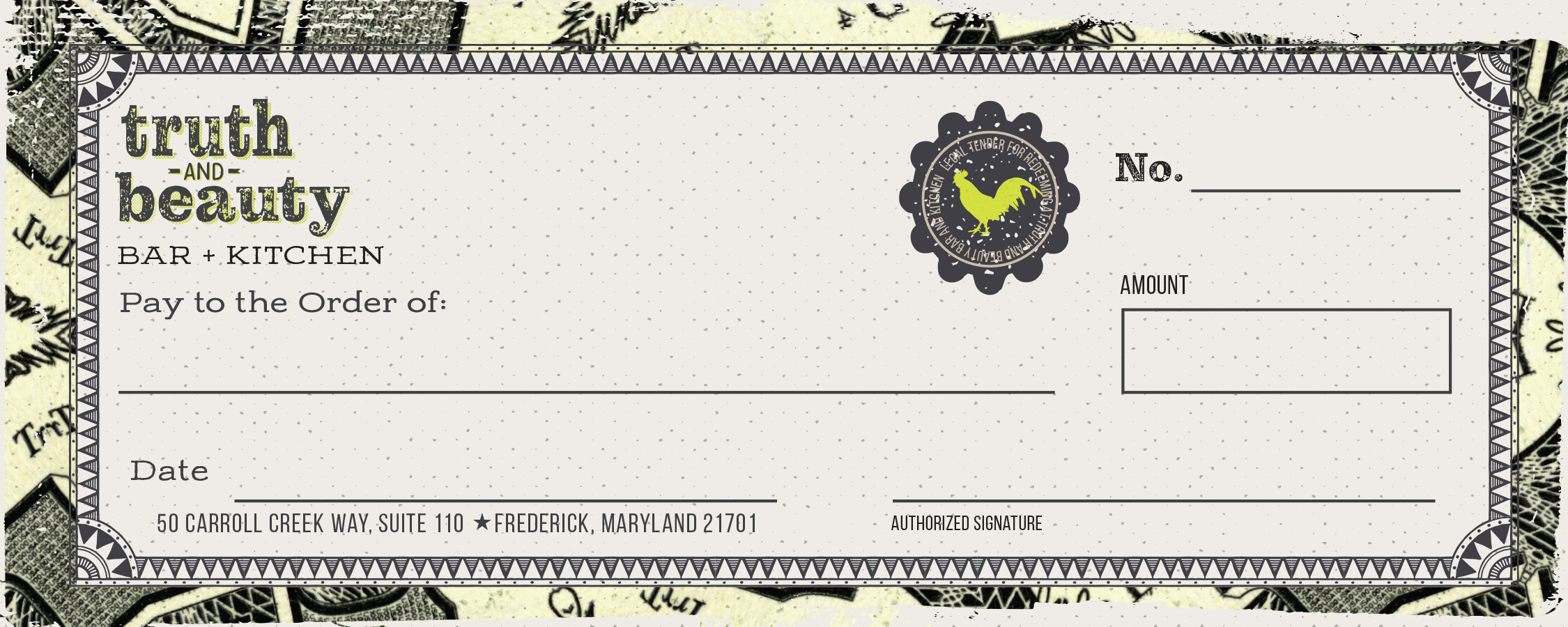Although Doug and I were very familiar with each other as working partners, this project definitely presented me with some problems. My first hurdle was the name itself. Originally pitched as "Truth & Beauty", I had difficulty visualizing the name as a restaurant. How could I manipulate those vague terms to signify food and dining? I focused on how those two words represent Doug's plates. Simple, artisan and gorgeous. I wanted to focus on deisgn elements that would mirror this concept. I chose hand-done elements and a distressed, vintage wood-cut tone. I wanted the logo to be modern, without being minimalist. We decided to add the tagline "Bar + Kitchen" to further reinforce the branding. Plates, cutlery and fauna had been involved in his previous brands, so I was carefull to avoid those. I also researched the existing competition in his area to make sure our brand would stand out amongst the crowd.